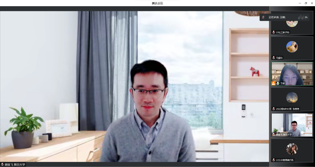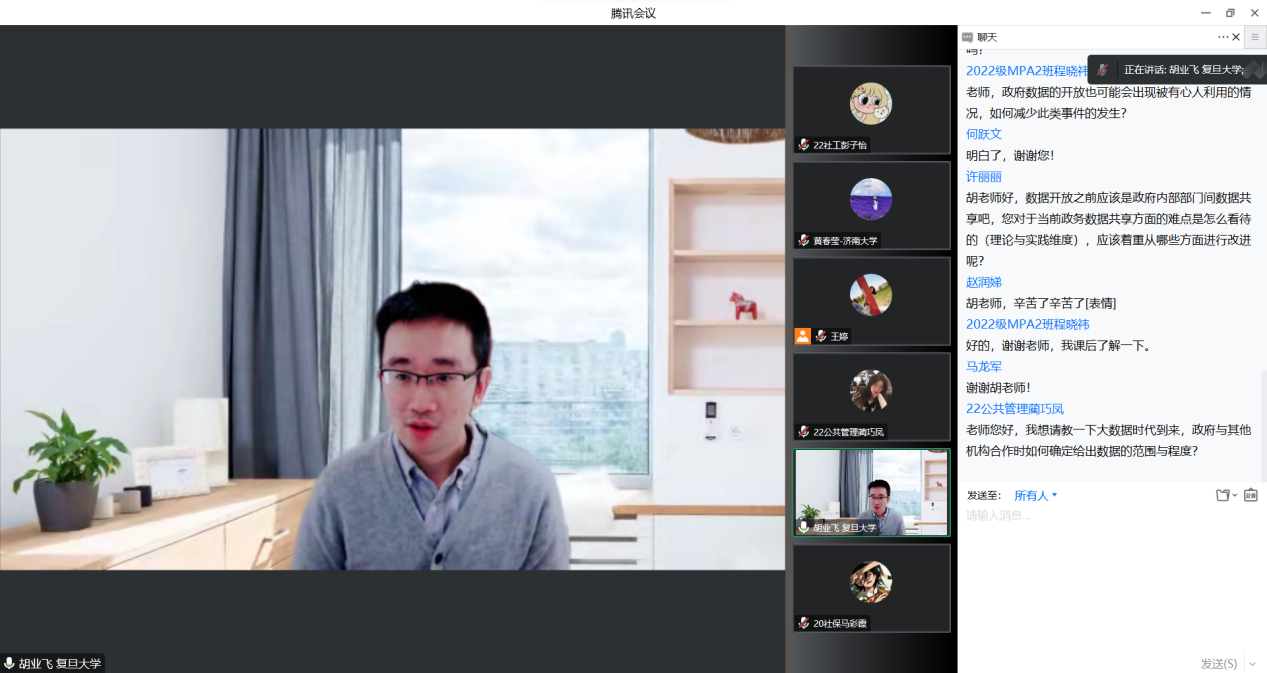 讲座尾声,胡老师与水果派师生进行了热烈地交流与讨论,并针对水果派 师生们提出的问题进行了认真回应。在讨论中,胡老师指出数据共享和数据开放是两个方向,共享的核心是协调的难度,而数据和信息的联系是数据是信息的载体。然后针对本次讲座,王老师向胡老师表达了感谢,并结合自己的体会对本场讲座作了最后总结,王老师指出胡老师从“老年人与诈骗”这一鲜活案例入手,以大数据时代的到临、数据的要素化、政府数据开放:一种合作治理创新这一主线,剥开了政府数据开放的底层逻辑。这样的形式使得本次讲座既轻松又有趣。王老师还指出胡老师不仅对研究问题具有自己的学术思想和理论探讨,而且胡老师对于研究现实热点及难点问题的路径逻辑,值得我们师生共同学习和共同探讨。