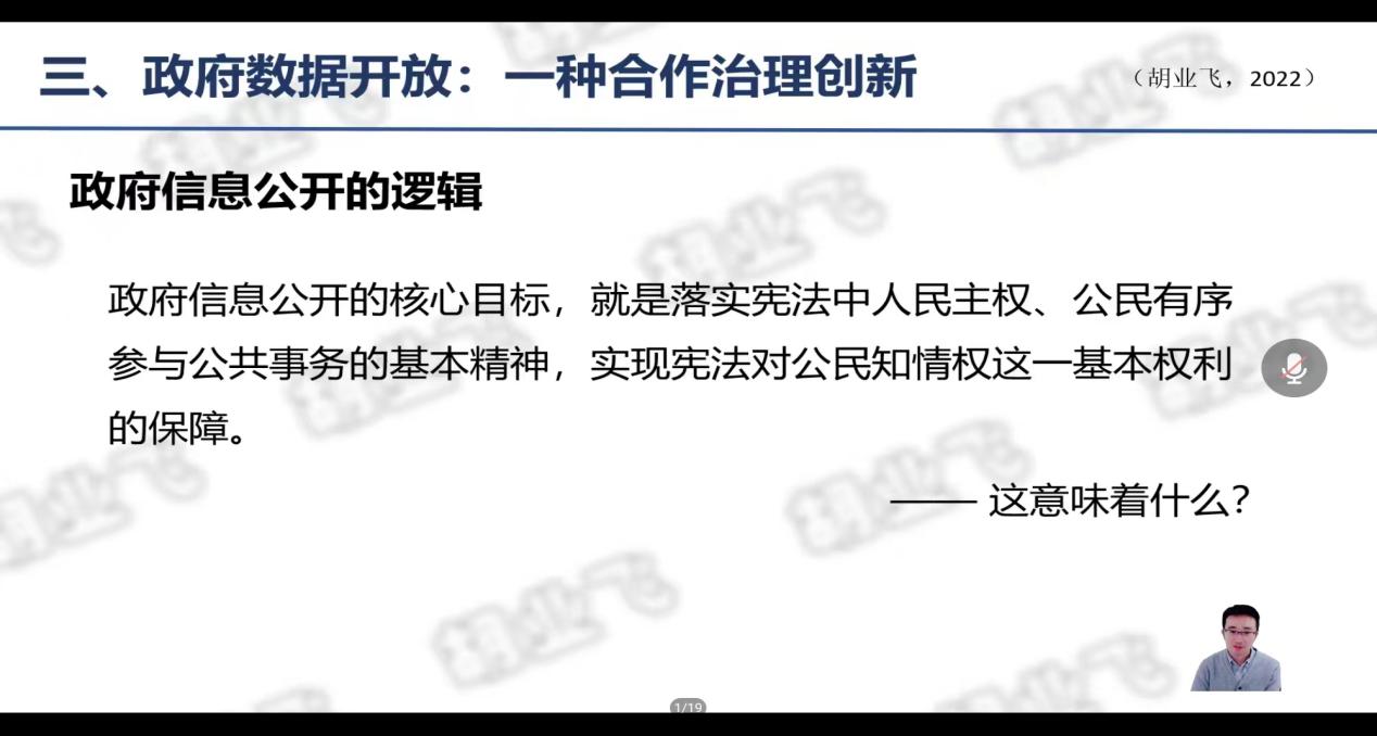 2022年12月15日19时,正值学校百廿校庆暨水果派 建院十周年院庆举行学术论坛系列学术讲座活动之际,应水果派 邀请,复旦大学国际关系与公共事务水果派 胡业飞副教授莅临云端,在线为水果派师生作了题为“政府数据开放的逻辑”的学术讲座。本次讲座由王婷老师主持,水果派 200多名师生参加了此次讲座。