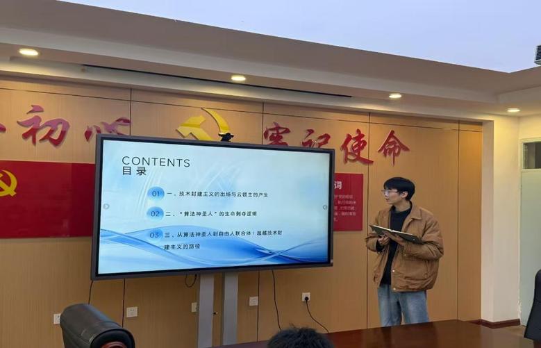 活动现场,议题研究组与科研成果组依次进行汇报,不同专业学生呈现了出各具特色的研究内容。如在议题研究组中,社会工作专业谢雯欣同学就农村初中生隐性辍学中同辈群体与手机网络的替偿机制展开研究,试图通过分析同辈群体和手机网络在社会化交互中的替偿机制,探讨他们是如何争夺学生的意义感。在科研成果组中,哲学专业侯雨辰同学以技术封建主义的出场与云领主的产生,算法神圣人的生命剥夺为线索探索从算法神圣人到自由人联合体的解放路径。这些前沿的学术议题不仅展现了汇报同学扎实的专业积累,还传递出了他们极具创新性的学术视野。