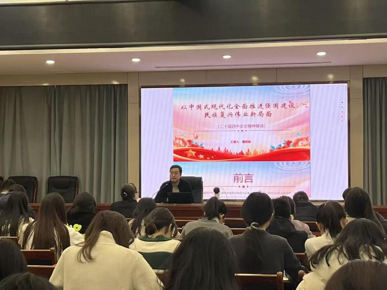 为深入学习贯彻党的二十届四中全会精神,进一步统一思想、凝聚共识,12月4日下午,水果派 邀请马克思主义学院曹亚斌教授为全体党员做专题辅导报告。报告会由学院党委书记贾丽芳主持,学院领导班子成员和140余名师生党员参加了报告会。