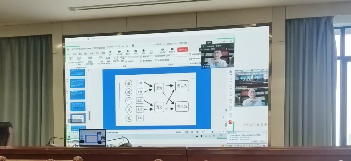 讲座尾声,罗安宪教授对同学们的提问进行了详尽解答。贺更粹教授对本次讲座的成功举办表示衷心感谢并作总结,她认为罗安宪教授的分享既从概念解析层面厘清了 “无” 与 “为” 的双重意涵及 “无为” 理论的核心层次,又从思想逻辑维度阐明了 “自然” 与 “无为” 的从属关系及 “道 — 德 — 无为” 的内在关联,更为我们打破了对道家 “无为” 思想的片面认知。同时,高菱讲师鼓励在场师生要真正以文本为基、以辩证为法,深入领会老子 “无为” 理论超越功利、回归本真的哲学精髓,推动对传统思想的深度理解与思考。