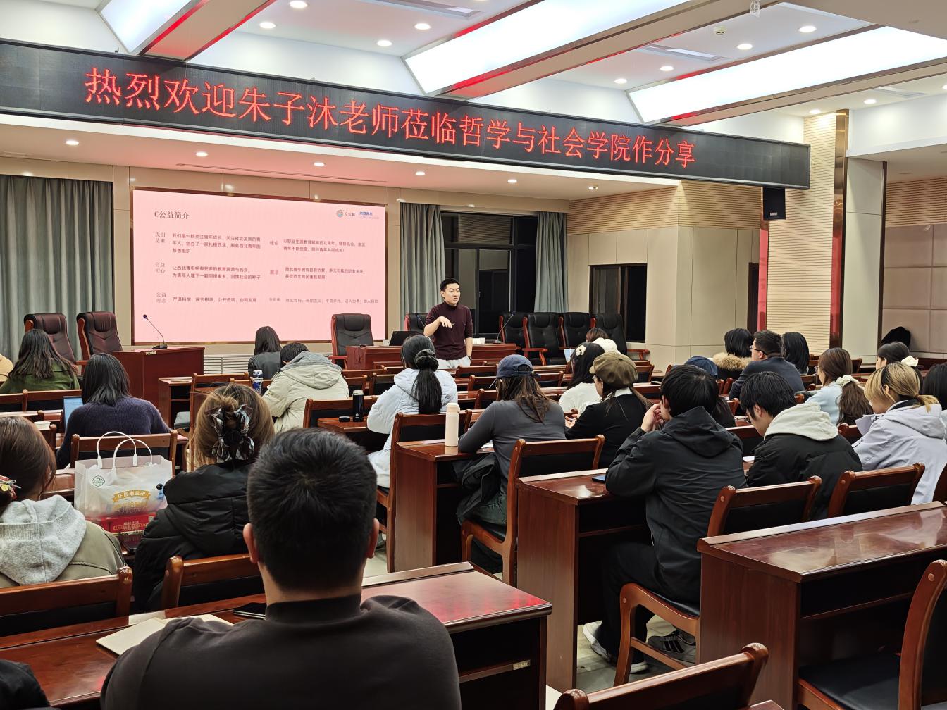 主持人何瑞老师首先向现场同学隆重介绍了核心分享嘉宾朱子沐,这位1994年出生的青年才俊兼具企业家与公益人双重身份,不仅是宁夏C公益的创始人,还担任宁夏青年企业家协会副秘书长、宁夏红十字会基金会副理事长等多项职务,是银川市高精尖缺人才。何瑞老师特别提到,朱子沐从高中时期便投身公益,2013年创办C公益,始终以职业生涯教育赋能西北青年为宗旨,通过链接资源、搭建平台,陪伴西北青年探索多元职业可能,促进区域发展。同时,何瑞老师也介绍了教育学院郑雅君老师、哲学系杜海涛副教授,强调三位嘉宾不同的学科背景将为同学们带来多维度的成长启发。
