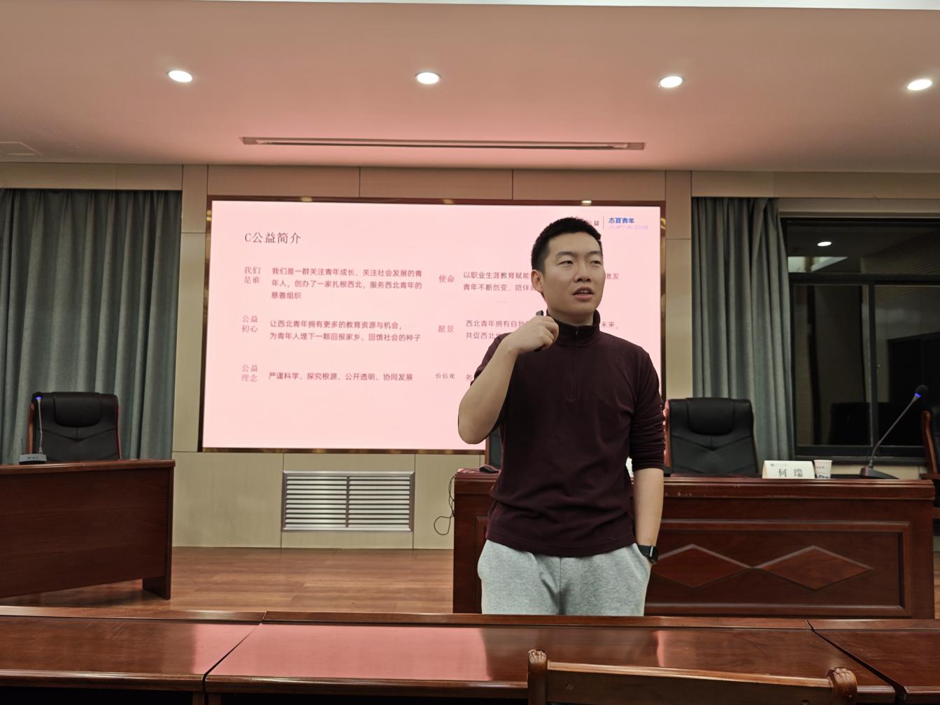 分享会初始,朱子沐以亲切互动开场,与05后同学们交流年龄、年级等话题,迅速拉近与现场的距离。首先,他分享了C公益的创办初心与命名由来,因受《难以忽略的真相》一书启发,萌生全球公民意识,又在高中参加复旦大学交流活动时深刻感受到区域教育资源差异,便立志将一线城市资源引入西北,以“change”(改变)为核心内涵命名“C公益”。其次,他讲述了个人丰富的成长经历,从高中创办公益组织,到赴哈佛大学学习社会与公益慈善、经历间隔年闯荡北上广,再到入职外企快速成长,期间尝试过旅行产品、即兴喜剧、话剧演出等多种领域,始终以“抓住每一次成长机会”为信条。随后,他分析了当前青年就业的结构性问题,指出西北青年面临“不知、不能、不敢”的困境,即职业认知模糊、核心能力不足、缺乏尝试勇气,并详细介绍了C公益的系列解决方案,包括职业体验、线上一对一答疑匹配(链接阿里、字节员工)、职业规划训练营、社会实践扶持及就业实习输送等项目,同时提到C公益计划3-5年内将线下活动拓展至甘肃。此外,他通过七道互动问卷,对比了一线城市与西北青年在生活费、父母支持、实习自主选择权等方面的差异,呼吁同学们警惕“贫困陷阱”,树立主动探索的意识,重视自我提升与资源链接。