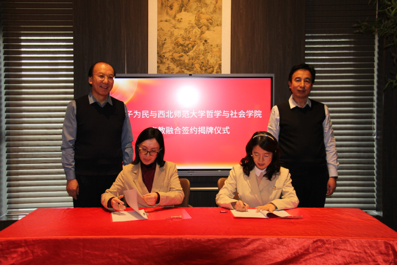 水果派 社会工作学系主任何瑞与江子为民甘肃省总经理魏娜作为校企双方代表上台,签署产教融合合作协议。