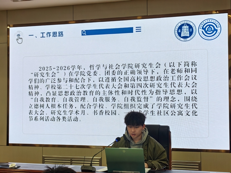 研究生会主席团成员王华禹围绕立德树人根本任务,介绍了研究生代表大会、学术月、书香校园、公寓文化节等系列活动的组织开展情况,总结了过去一年的工作成果与收获,并秉持“自我教育、自我管理、自我服务、自我监督”的理念,梳理现存问题并提出了相应的解决方向。